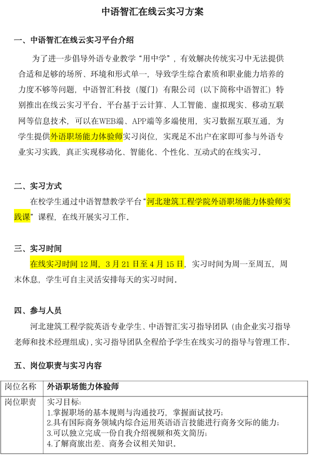 线上实习项目名称为“河北建筑工程学院外语职场能力体验师实践课”,主要实践领域包括:英文简历制作,商务会议,商务差旅,商务沟通。通过线上平台,学生实现足不出户在家即可参与外语专业实习实践,真正实现移动化、智能化、个性化、互动式的在线实习。
