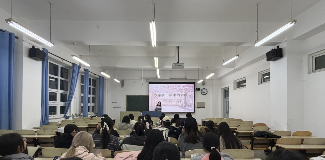 孙老师为听众带来了一场题为《汉字在日语中的发展》的讲座。她指出,汉字在日语中的发展,是一个从“全盘借用”到“改造再造”,再到如今“和汉共存”的精彩故事。汉字于5世纪左右经朝鲜半岛传入日本,初期用于标记人名、地名。日本借用汉字音读与训读,并发展出万叶假名,后简化为平假名和片假名。汉字深刻影响了日语词汇体系,成为书写正式文书、学术著作及佛教典籍的核心工具,奠定了日本古代国家的行政与思想基础。同时,汉字书法、汉诗及儒学伦理融入日本文化,塑造了其文字审美与精神世界,至今仍在社会生活中占据重要地位。孙老师的讲座为即将开启第二外语学习的同学们提供了兴趣引导与初步方向。